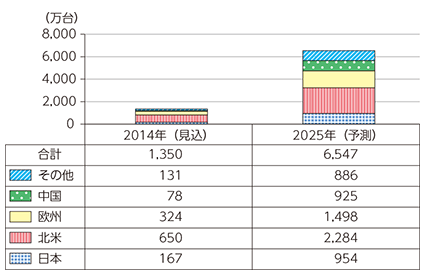 2014年のコネクティッドカーの世界市場は、2025年は新車のコネクティッドカーと既存車のコネクティッドカーを合わせて、2013年比6倍弱の6500万台を超えると予測されています。