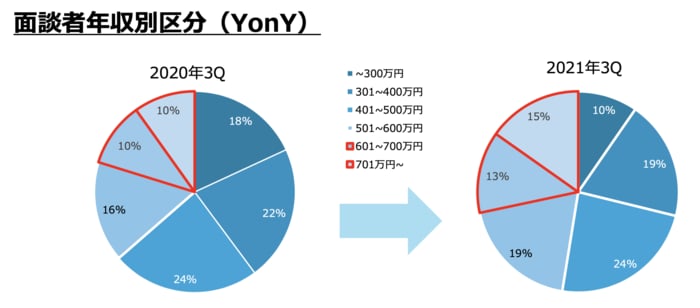 株式会社GEEKLYが2021年10月~12月の間、当該会社を利用した求職者および企業に行ったアンケートによると、現年収600万円以上のハイクラス層が増えたことがわかりました。(2022年1月18日公表)。