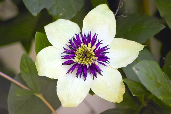 中国原産で日本でもなじみ深いテッセン。中心が紫で花弁が白の花が咲き、一見トケイソウにも似ています。和風・洋風どちらの庭にもよく合います。