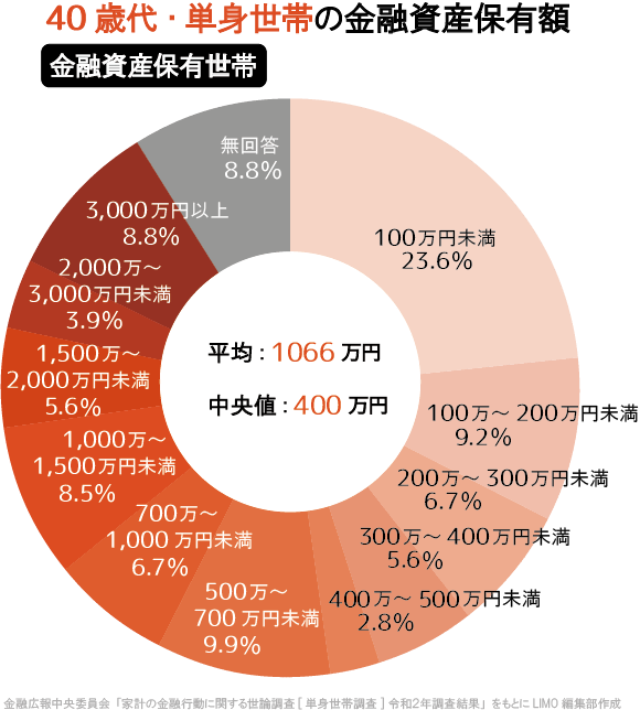 金融資産を保有しているおひとりさまでみると、その平均は1066万円、中央値は400万円でした。