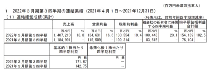 売上高は1兆4072億円(前年同期比+18.8%)、営業利益は1346億円(同+16.6%)、純利益は1004億円(同+20.1%)となりました。