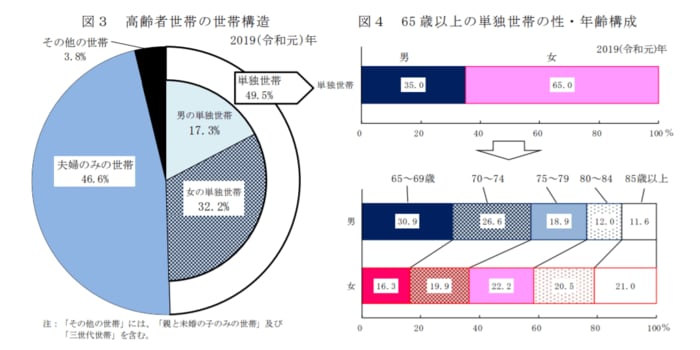 少し前の調査になります※が、厚生労働省の「2019年国民生活基礎調査」によると、65歳以上の方がいる世帯のうち、高齢者世帯は「単独世帯」が736万9000世帯(高齢者世帯の49.5%)、「夫婦のみの世帯」が693万8000世帯(同46.6%)です。