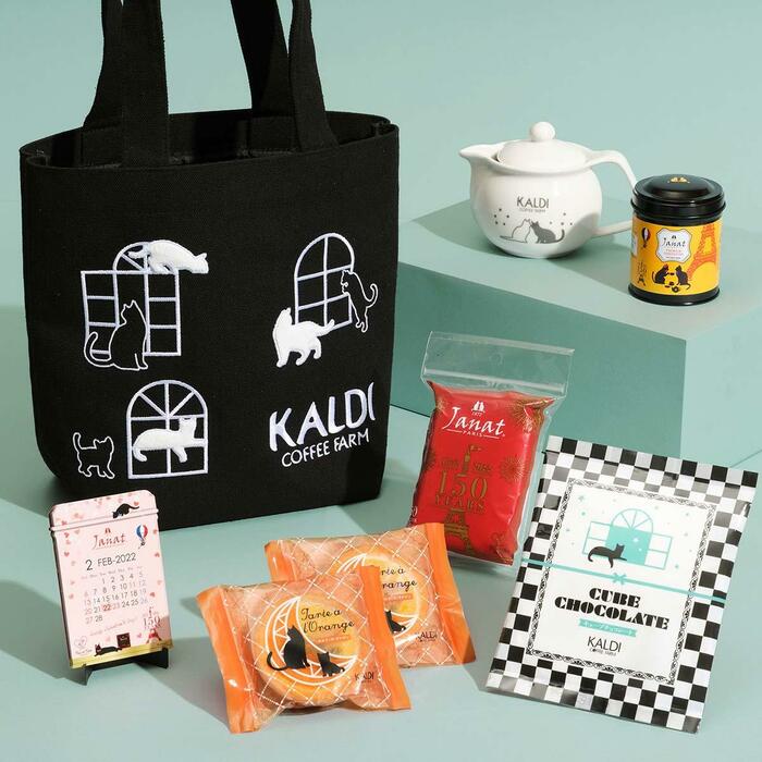 ・内容:オリジナル タルト・オ・ランジェ(2個入)、オリジナル キューブチョコレート(個包装6個入)、ジャンナッツ ダージリン(40g)、ジャンナッツ カレンダー(1個)、ジャンナッツ ティーフィルター(1~2杯分50枚入)、オリジナル ティーポット 陶器(1個)、オリジナル ネコの日バッグプレミアム(1個)※カレンダーの期間は2022年2月~2023年2月です