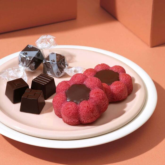 スイートチョコレートをトッピングしたフランボワーズ風味のケーキ「ガトー・オ・フルール」と口どけなめらかなビターチョコレート「ショコラ・ノワール」入り。また、お菓子と一緒に楽しめるフランスの紅茶「ジャンナッツ ダージリン(ティーバッグ)」に加え、毎年人気の「卓上カレンダー」と、可愛いネコのイラストが描かれた陶器の「シュガーポット」の全5種のアイテム入りです。