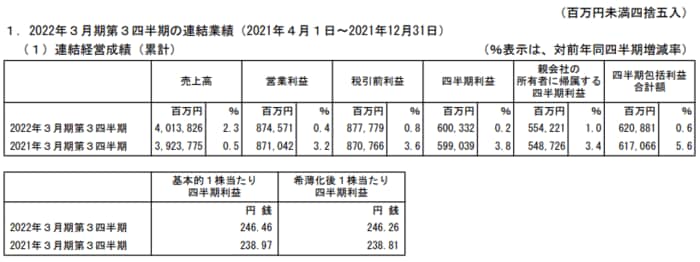 売上高は4兆0138億円(前年同期比+2.3%)、営業利益は8745億円(同+0.4%)、親会社の所有者に帰属する四半期利益純利益は5542億円(同+1.0%)となりました。
