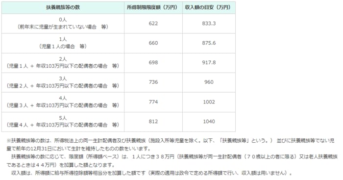 同じ698万円を超える場合でも、年収が103万円までの妻を扶養していて、子どもが2人いるのであれば、所得が736万円までは、児童手当が支給されることになります。