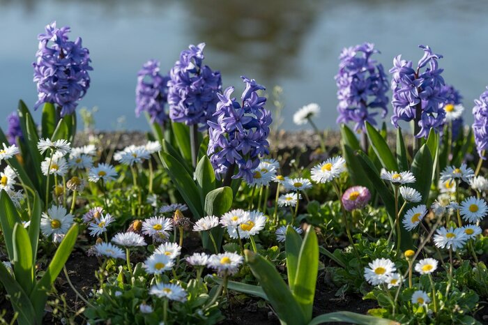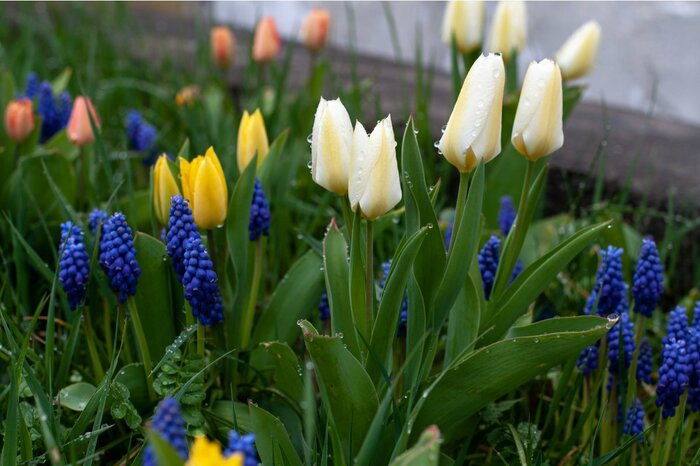 ムスカリ、ヒヤシンスも春を代表する球根植物。ムスカリは青みを帯びた小花をたくさん咲かせる花で、最近は切り花として飾られることも多い人気上昇中の花です。花が小ぶりなので、いろいろな花との寄せ植えでも楽しめます。