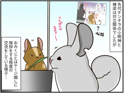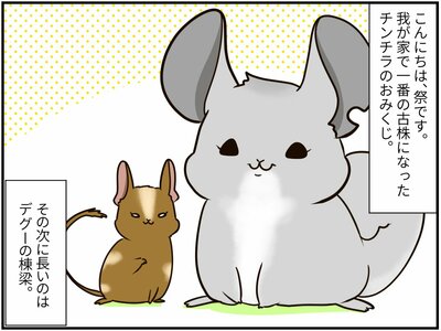 祭さんの飼うネズミさんたちの中で、現在最も古株となったチンチラの「おみくじ」ちゃんと、その次に長いテグーの「棟梁」ちゃん。祭さんは、性格が穏やかな2匹を会わせてみることにしたのですが…。