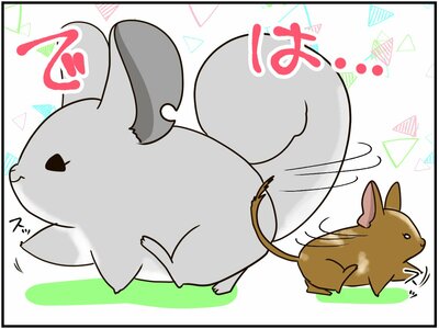 漫画家の祭さんは、おみくじちゃんとあみだちゃんというチンチラの母子、元保護チンチラの福くん、デグーの棟梁ちゃんというネズミさんたちと一緒に生活しています。