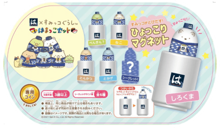 今回登場したのは、はま寿司のユニフォームを着た限定デザインのすみっコキャラたち。「おきあがりこぼしスタンプ」と「ひょっこりマグネット」になって、専用マシーンから登場します。