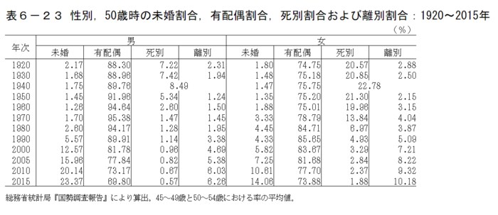 その後、男女ともに増加しており、2015年には男性で23.37%、女性で14.06%が一生独身です。