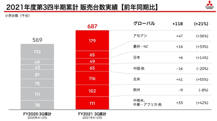 三菱自動車の株価はどうなるか「販売増&為替変動で利益急増」Q3決算は営業黒字回復 2022.01.31 21:15 公開 執筆者LIMO編集部 監修者石津 大希 copy URL 目次[開く] 決算での売上高と営業利益はどうだったか 事業の動向はどうであったのか まとめにかえて 参考資料 事業の動向はどうであったのか 出所:三菱自動車工業「2022年3月期 第3四半期決算説明資料」 営業利益の変動要因を見てみると、台数の増加と為替変動の影響が大きいことがわかります。 出所:三菱自動車工業「2022年3月期 第3四半期決算説明資料」 販売動向を見ると、アセアンや北米、中南米、中東、アフリカなどにおける販売増加が大きく貢献しています。 一方、中国などは販売が減少しています。 まとめにかえて < 1 2 3 > 関連タグ #三菱自動車工業 #株式投資 #株価 #投資 #資産運用 #決算 注目コンテンツ 年齢入れて5秒で見積もり!人気の医療保険ランキングをチェック[PR] 【LIMOで懸賞】新しいプレゼントが続々登場中!最新情報はこちらから[PR] 退院後の通院治療に3000円。通院保障がつけられる医療保険はこれ![PR] あわせて読みたい