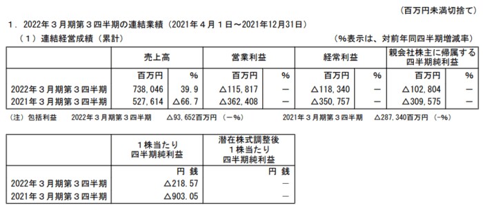 売上高は738,046百万円(前年同期比+39.9%)、営業利益は△115,817百万円(前年同期は△362,408百万円)、経常利益は△118,340百万円(同△350,757百万円)、親会社株主に帰属する四半期純利益は△102,804百万円(同△309,575百万円)となりました。