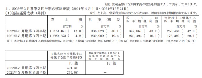 売上高は1兆3794億円(前年同期比+13.0%)、営業利益は3360億円(同+40.1%)、親会社株主に帰属する四半期純利益は2504億円(同+42.0%)となりました。