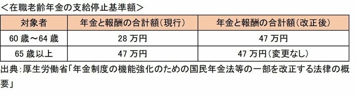 今回の改正で変わるのは60~64歳までの支給停止となる基準額で、現行の28万円から47万円となります。47万円は65歳以降と基準額と同じです。