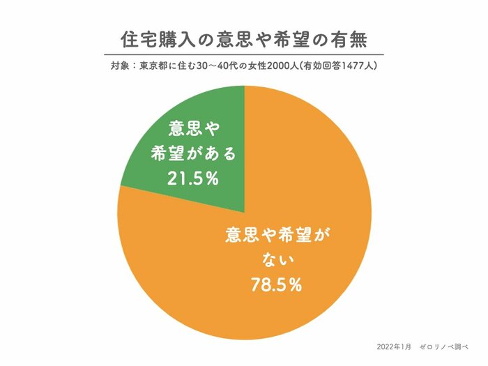 株式会社groove agent(ゼロリノベ)が、東京都在住30代〜40代の女性2000人に行ったアンケート「住宅購入に対する意思や希望の有無とその理由、購入行動を起こすポイントについて」によると、「購入の意思や希望はない」が78.5%に上ることがわかりました(2022年1月31日発表)。