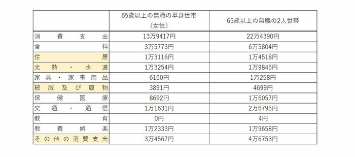 その内訳を見てみると「食費」や「保健医療」、「交通・通信」といった項目では、65歳以上の女性の単身世帯より、65歳以上の無職の2人世帯の金額は2倍ほどの金額になっています。
