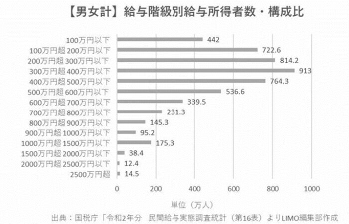 分布図を見る限り、ボリュームゾーンは「300万円超 400 万円以下」です。その次が「200 万円超 300万円以下」。500万円超になると一気にボリュームダウンすることがよくわかります。