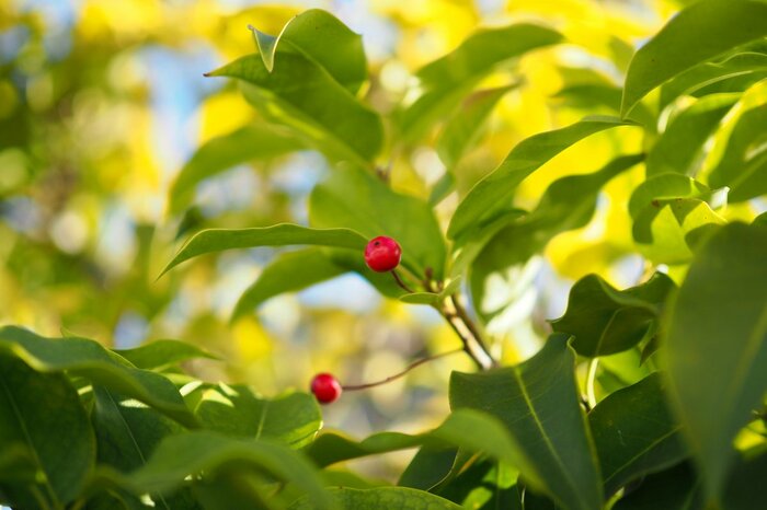 濃い緑色の葉と赤い実のコントラストが印象的なソヨゴ。葉が風でそよそよとたなびくことから、ソヨゴと名付けられたとも言われています。