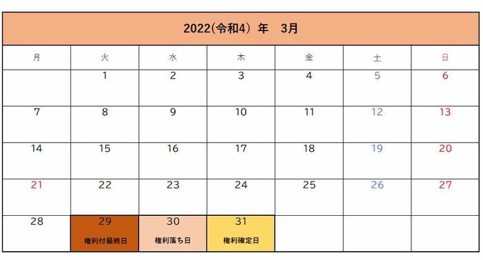 たとえば、2022年3月31日が通期決算の会社であれば、本決算の権利確定日と権利付最終日は以下のようになります。