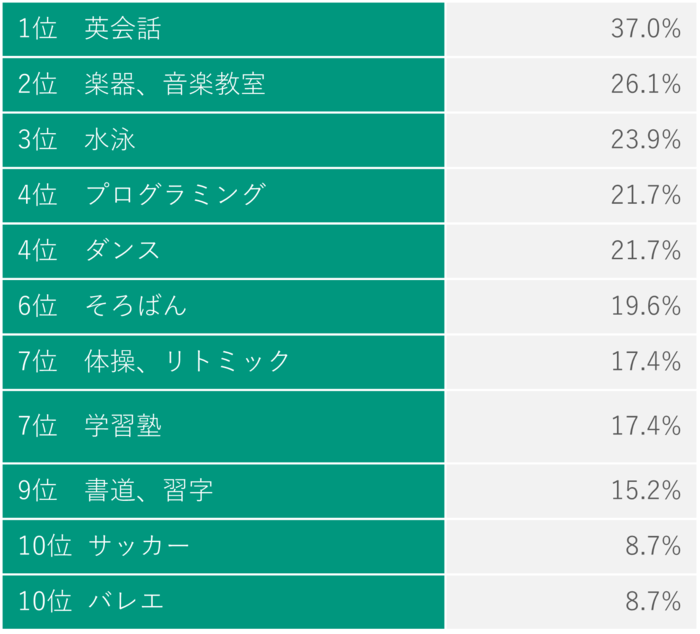 第1位は英会話、続いて楽器や音楽教室、水泳が続きました。第4位にはプログラミングがランクイン。2020年度から小学校で始まっているプログラミング教育の影響もあり、将来性の高い習い事にも関心が集まっています。