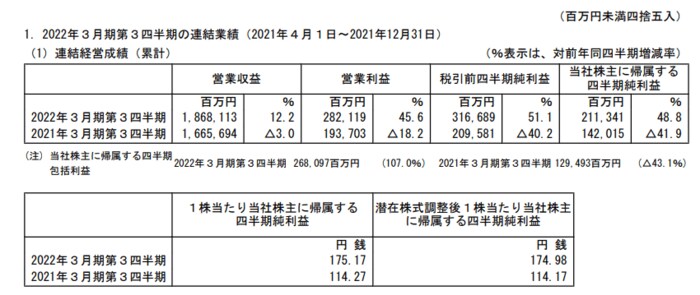 オリックスの2022年3月期3Qの営業収益は1兆8681億円(前年同期比+12.2%)、営業利益は2821億円(同+45.6%)、株主に帰属する四半期純利益は2113億円(同+48.8%)となりました。
