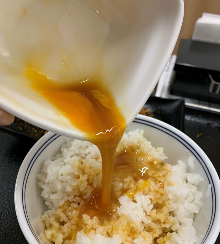 味が染み込んだつゆを、卵と混ぜ合わせることで、さらに濃厚で深い卵かけご飯が食べられます。醤油で食べる卵かけご飯よりも、旨味が多いので、より濃厚な卵かけご飯が完成します。