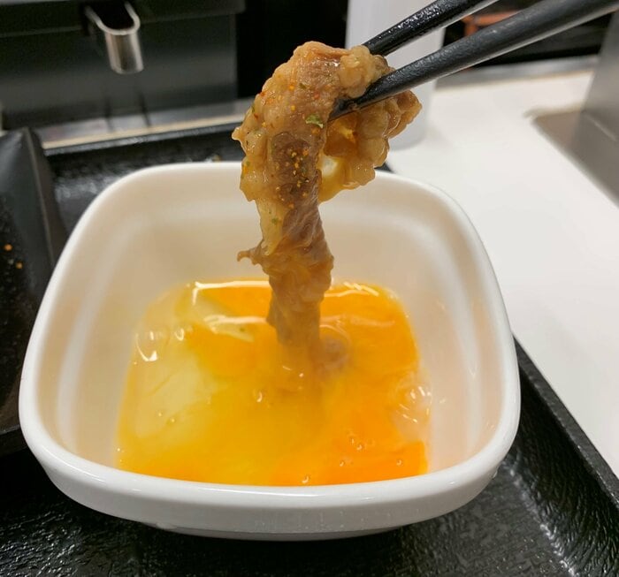 特製卵かけご飯と牛肉を一緒に食べれば、卵の濃厚な味わいがつゆによってさらに深くなり、そこに牛肉の旨味が加わるので、口の中が何十もの混ざり合った風味や旨味が駆け回ります。