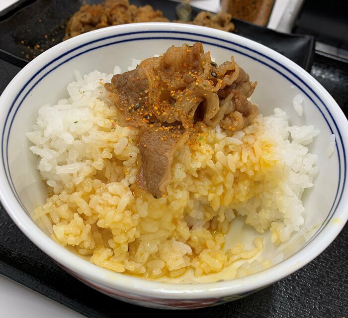 味噌汁を軽く飲んであと、まずは通常通りに牛肉をおかずにご飯を食べます。つゆがご飯に浸ってないので白米本来の味が楽しめます。