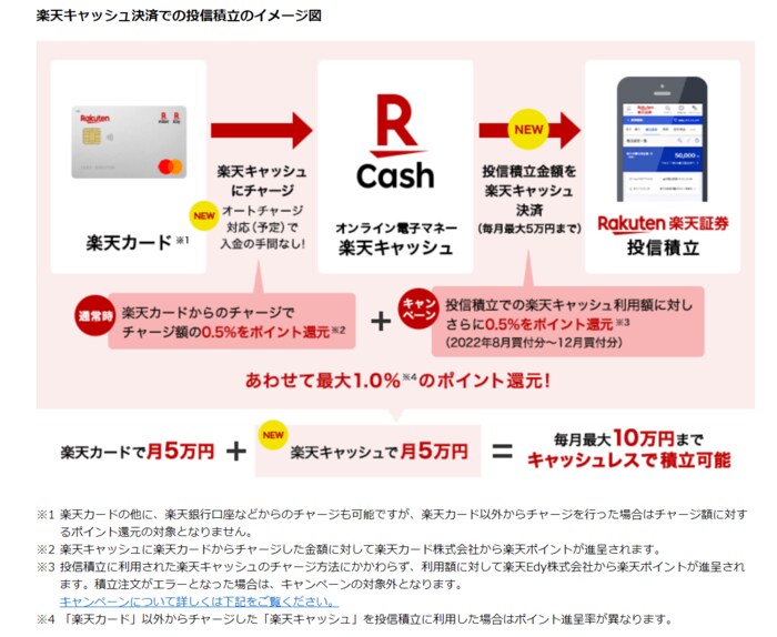 また、これにより毎月「楽天カード決済(毎月5万円/0.2%の場合100ポイント)+楽天キャッシュ決済(毎月5万円/0.5%で250ポイント)=最大10万円」までキャッシュレスでの投信積立も可能になります。投信積立を積極的に行いたい人には良いでしょう。