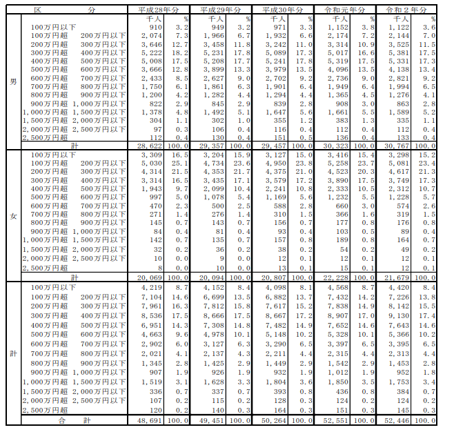 それでは、国税庁の「令和2年分(2020年)民間給与実態統計調査」を参考に、年収600万円の割合を全体と男女別に見ていきましょう。