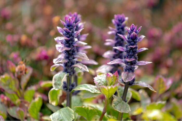 アジュガはシソ科の常緑の多年草です。地面を覆うように生長し、耐陰性が高くシェードガーデンにも向いています。
