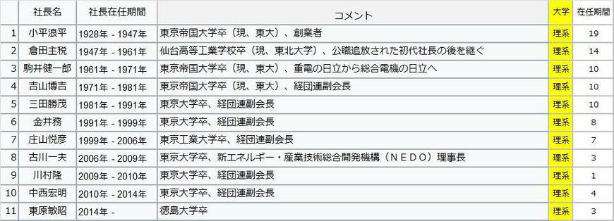 一方、日立は創業社長である小平浪平氏から数えて現在の社長の東原敏昭氏は11代目の社長となりますが、この間、全員が理系出身者でした。