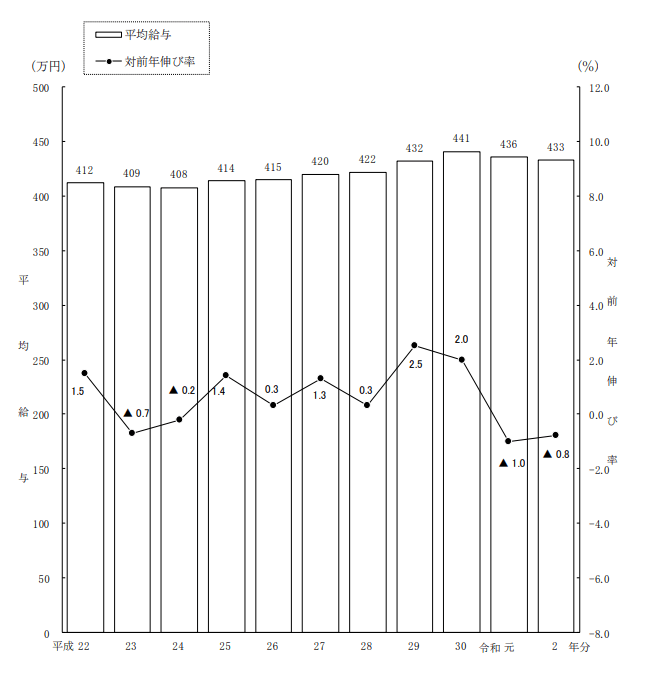 国税庁が発表した「令和2年(2020年)分民間給与実態統計調査」によると、1年間を通じて勤務した給与所得者の1人あたりの平均給与は平均433万円となっています。