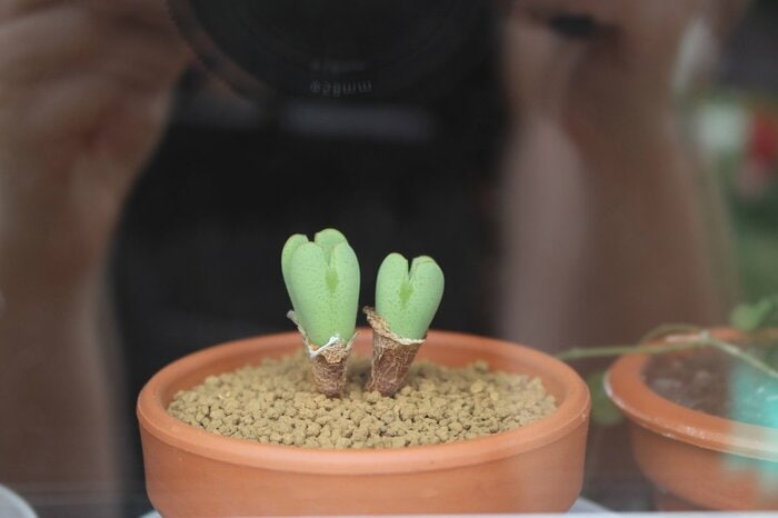 リトープスには光合成のため光を取り込む、透き通る天窓があるのも特徴。中心の割れ目から花が咲く様子も可愛らしい多肉植物です。