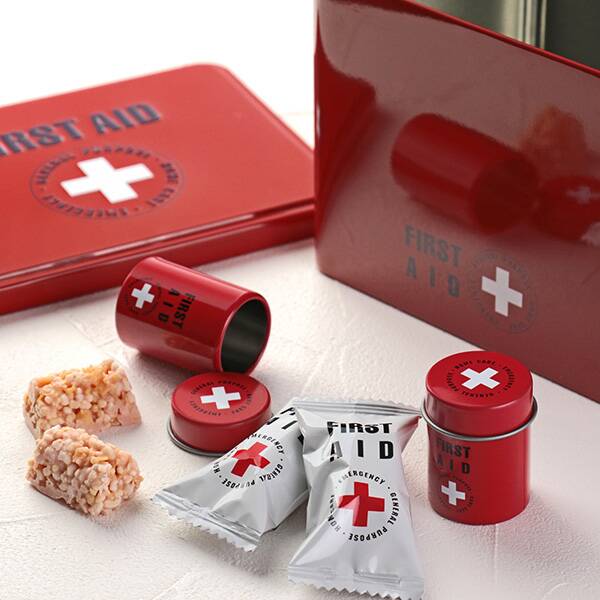 救急箱のようなデザインの缶に個包装のクランチチョコ(ホワイト)とミニ缶を詰めた商品です。お菓子を食べ終わったら、小物入れやコスメを入れたり本物の薬入れにしてもかわいいですね。缶のカラーはレッドとカーキの2種類です。
