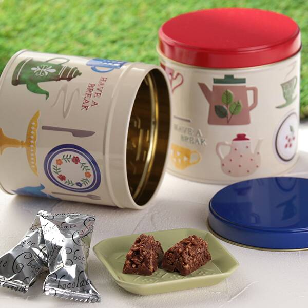 かわいいティーポットのイラストが描かれた缶のなかに、チョコクランチが6個入った商品です。缶の色は赤いフタと青いフタの2種類、オンラインストアではいずれかひとつのお届けとなります。
