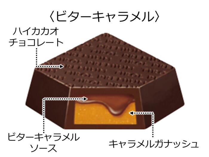 土屋公二氏が味とパッケージデザインを監修することで、高級感のある商品に仕上がっています。味は、マダガスカル産カカオマス使用のハイカカオチョコの中にキャラメルガナッシュとビターキャラメルソースを閉じ込めるなどこだわりの逸品です。
