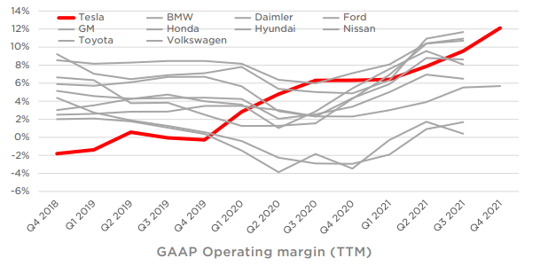 GM、トヨタ、BMW、ホンダ、フォルクスワーゲン、ダイムラー、現代、フォード、日産などの競合する自動車メーカーと営業利益率を比較していますが、直近ではテスラの収益率はトップに位置付けられています。