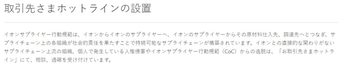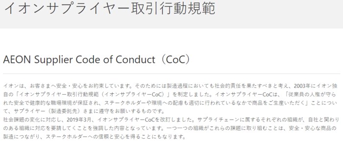イオンは「サプライヤー取引行動規範」というものを定め、各取引先に遵守を要請しています。