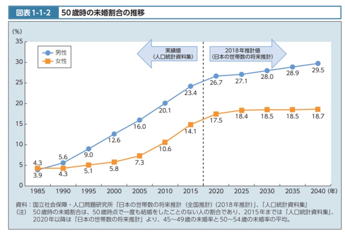 上記を見ると、2040年には男性29.5%、女性18.7%と推計されています。つまり、いま32歳の人が50歳になるころには男性のおよそ3割が未婚なのでしょう。