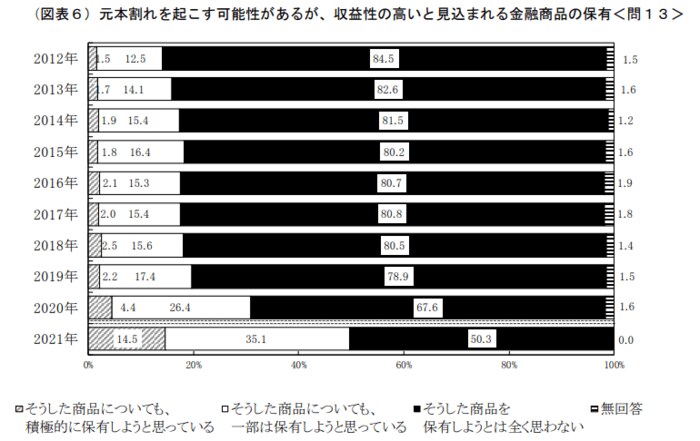 また、「元本割れを起こす可能性があるが、収益性の高いと見込まれる金融商品」について、「そうした商品を保有しようとは全く思わない」と考える人は2020年の67.6%から2021年には50.3%へと低下し、「積極的に保有しようと思っている」「一部は保有しようと思っている」と考える人の合算は30.8%から一気に49.6%へと増加しました。