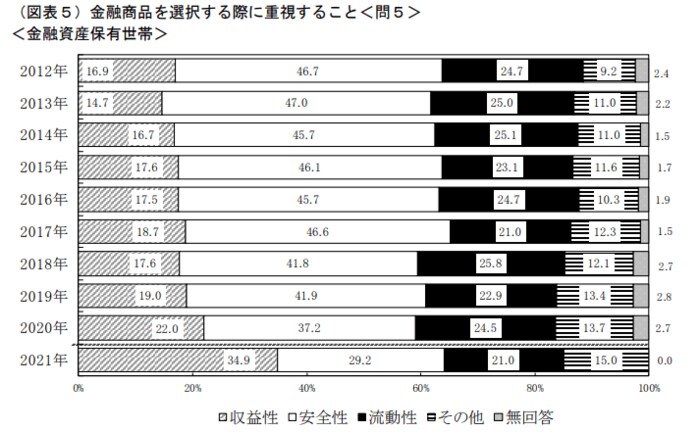 具体的には、「金融商品を選択する際に重視すること」で、安全性を選ぶ人の割合は2020年の37.2%から2021年には29.2%へと低下し、一方で収益性を選ぶ人は22.0%から34.9%と大幅に増えました。