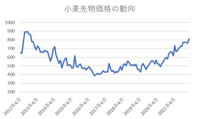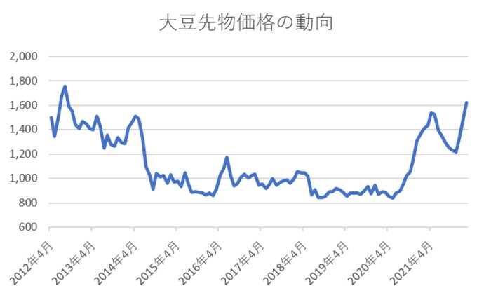 上の図は、小麦、大豆、トウモロコシの先物価格の推移を表しています。