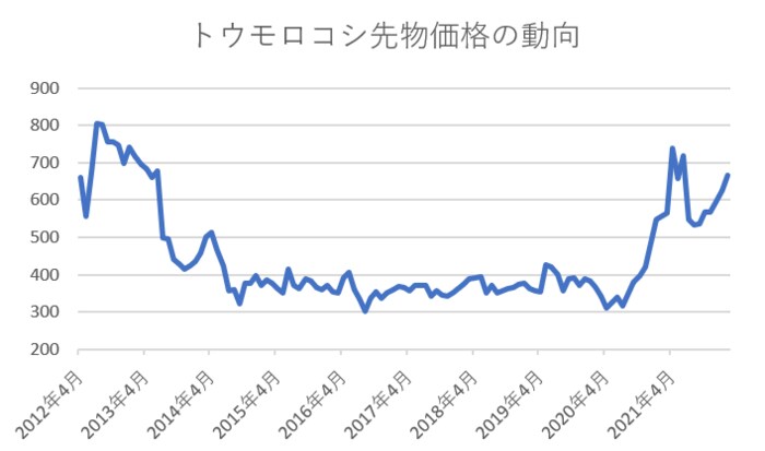 小麦と大豆は9年ぶりの高水準で、トウモロコシも同様にここ10年においての高値圏で推移しました。