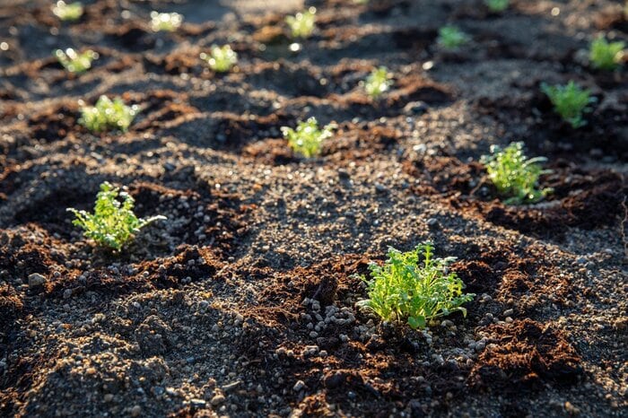 種まきのときは耕した土の表面を慣らし、1センチほどの間隔を空けながら1センチほどの深さで種をまきます。複数列で種まきをおこなう場合は、列の間隔を10~15センチ程度空けましょう。