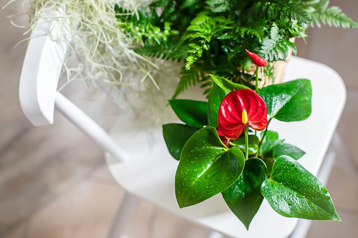 アンスリウムは花のような赤やピンク、白の苞がユニークな南国風の植物。下に伸びるポトスを植えれば、動きがうまれ、ボリュームのある寄せ植えになります。