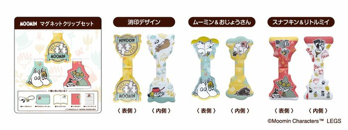 ムーミンとその仲間たちがデザインされたマグネットクリップです。「消印デザイン」「ムーミン&おじょうさん」「スナフキン&リトルミイ」の3種類のデザインがセットになっています。しおりや、ケーブルバンドなどとして活用できるアイテムです。