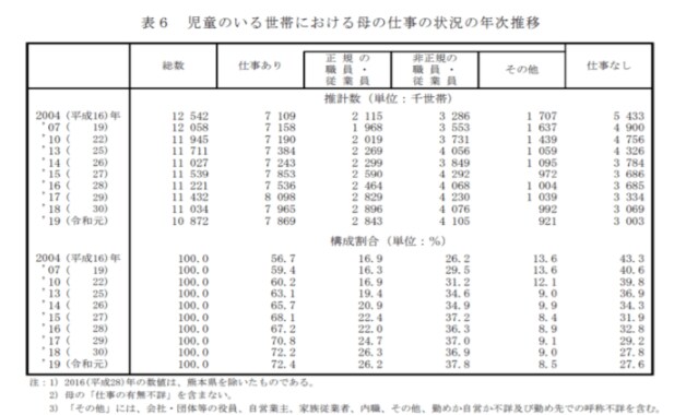 まずは、女性の仕事の状況について、少し前の調査にはなりますが、厚生労働省の「2019年国民生活基礎調査の概況」をみてみましょう。