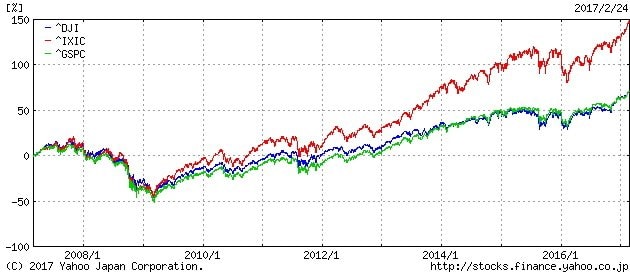 さて、次に過去10年間のNYダウのパフォーマンスを見てみましょう。グラフの青線がNYダウ、赤線がナスダック総合指数、緑線がS&P500指数です。